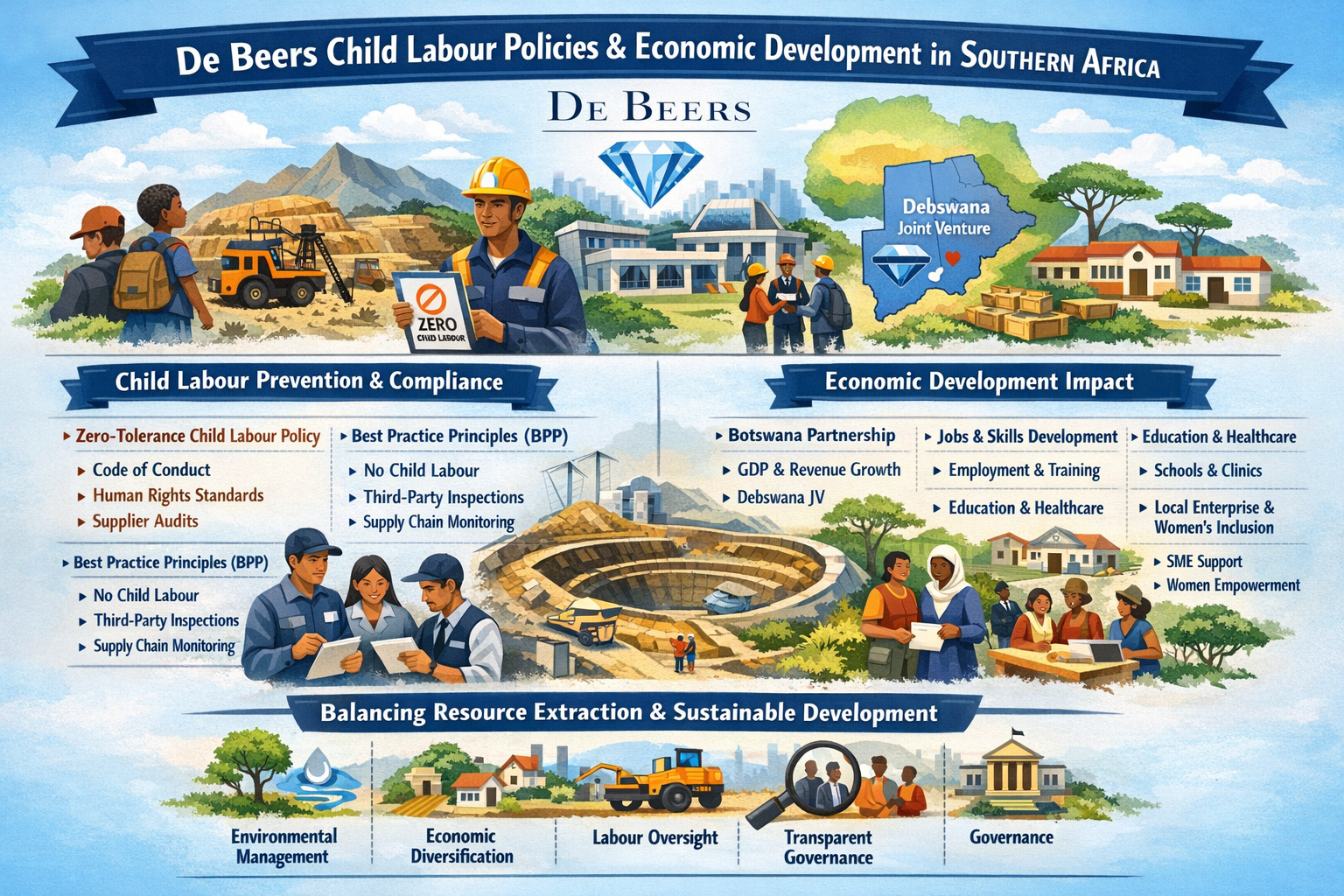 This updated analysis examines De Beers’ child labour policies, its Best Practice Principles framework, and its economic development role in Southern Africa.